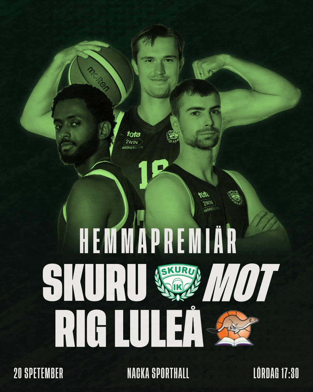 På lördag smäller det med premiär i Division 1 för Skuru Baskets herrlag. Vi har RIG Luleå på besök, Riksbasketgymnasiet i Luleå som samlar några av landets främsta unga basketspelare. I truppen för RIG Luleå finns även Skurus egna spelare Malte Edlund, som vi hälsar särskilt välkommen ”hem” till Nacka…